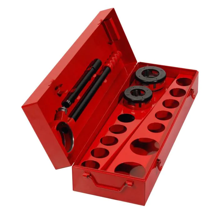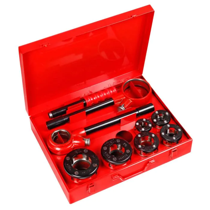 Ce coffret comprend des têtes adaptées pour le filetage en BSPT droite et gauche sur divers diamètres allant jusqu’à 2″. Conçu pour être utilisé avec des tubes conformes aux normes EN 10255 S et W, il offre une solution robuste pour les professionnels du bâtiment. Les bras en tube acier permettent une manipulation facile tout en garantissant la précision nécessaire lors du filetage.