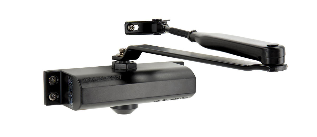 Le ferme-porte DC110 est un appareil à bras compas à technologie pignon crémaillère.